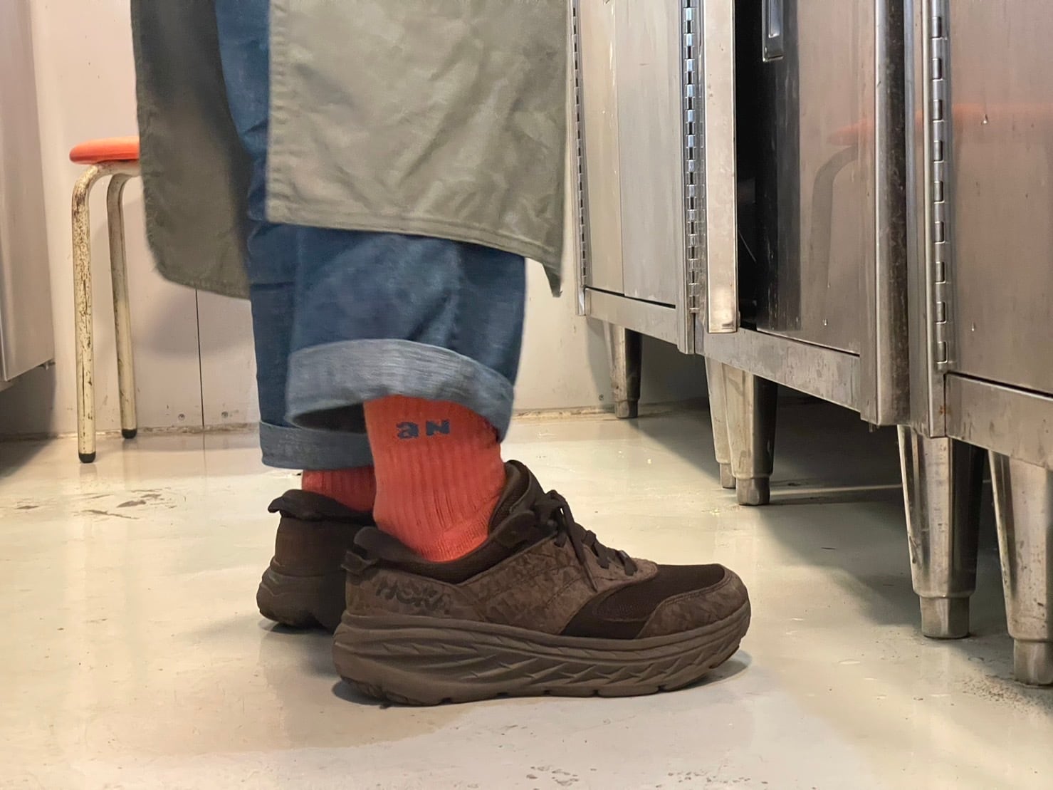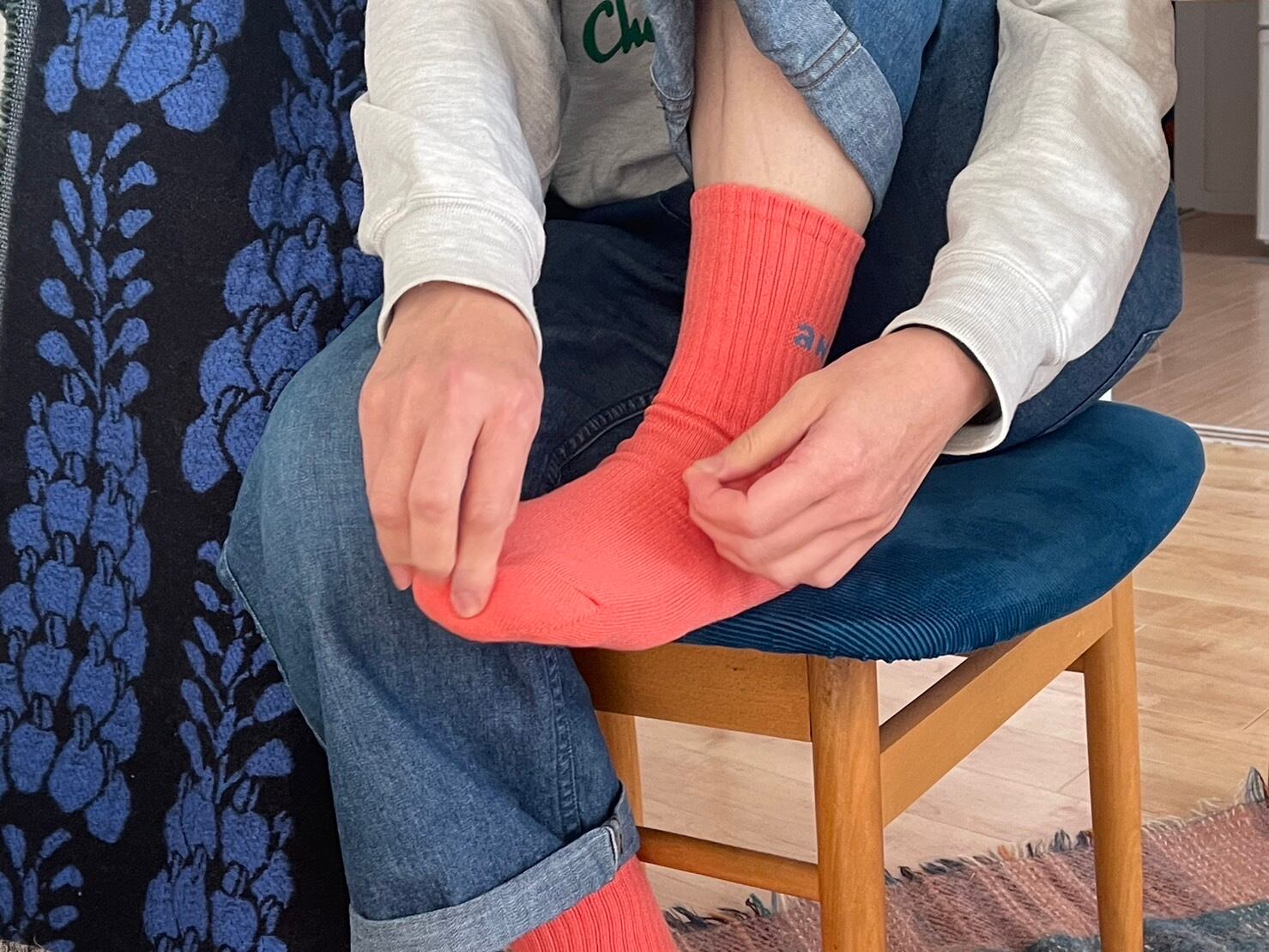 足店から甲の部分は程よりクッション性のあるパイル仕立て。足首まわりは、立ち仕事で疲れの溜まりやすく浮腫みやすい私達のような人でも、しっかり安定感のありつつも、尚且つ締めつけが辛く無いよう和らげて作っていただきました。